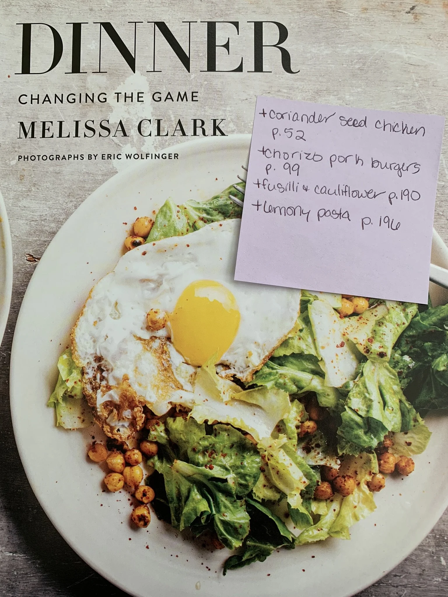 Something new I’ve done recently is to put a sticky note inside the cover of any cookbook I’ve cooked from and list the recipes and page numbers for what I’ve made. See what I’ve made from “Dinner: Changing the Game” in the pic below. Then on the page of the actual recipe, I’ll make notes such as if it’s good or not, what I would change if I made it again, and if it’s repeatable or makes good leftovers. I was starting to forget what I had made so this has been helpful to keep track of what I’ve put time, money, and effort into. There’s no need to repeat something that wasn’t so good. And on the reverse, it’s good to repeat recipes that I know I will like. So if I need inspiration, I can flip open the cover of my cookbook and find something to make quickly.