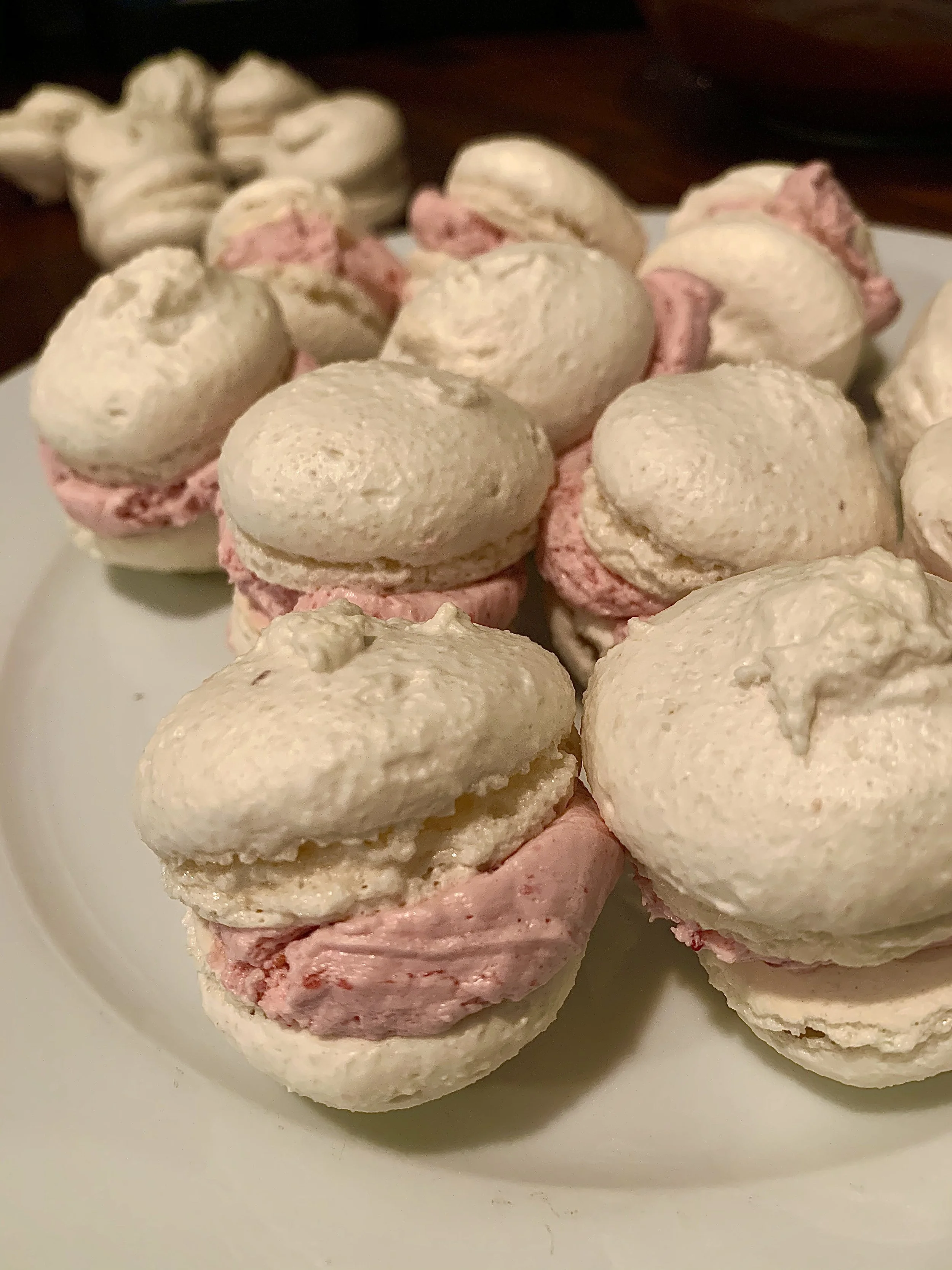 The instructor went through step-by-step how to make macaroons as we all followed along. It was nice to be in my own kitchen using my own utensils and equipment to make these. I’ve never made macaroons before, and I’m glad that I had a live instructor teaching me how to do it. It doesn’t seem like an easy pastry to make for the first time simply by reading a recipe. He gave many tips along the way to help you tell if your batter was done being whipped or if your cookies had a skin on them which they need before baking. I think this would have been difficult to convey all these nuances by a written recipe. It was great to have the live, helpful pointers and tips along the way. We also made a chocolate ganache for the inside of the shells once they baked and cooled. But the ganache had to set up overnight so I had to wait on that. But in the ingredient kit, they also brought a pre-made raspberry cream (which was incredible) so we could fill the shells that same day.